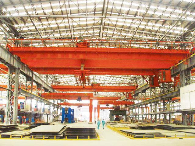 本起重機(jī)采用掛梁吊運(yùn)長(zhǎng)件鋼坯、板材、棒材、盤圓等物品,配置電磁吸盤或夾鉗或特殊群鉤進(jìn)行吊裝,主要由箱形橋架、起重小車、大車運(yùn)行機(jī)構(gòu)、司機(jī)室和電氣控制系統(tǒng)組成,配有停電保磁系統(tǒng)。起升機(jī)構(gòu)多采用單電機(jī)、雙減速器、雙卷筒布置,呈雙吊點(diǎn)形式。掛梁布置形式分垂直于主梁或平行于主梁兩種。其余形式與QD型起重機(jī)相同。